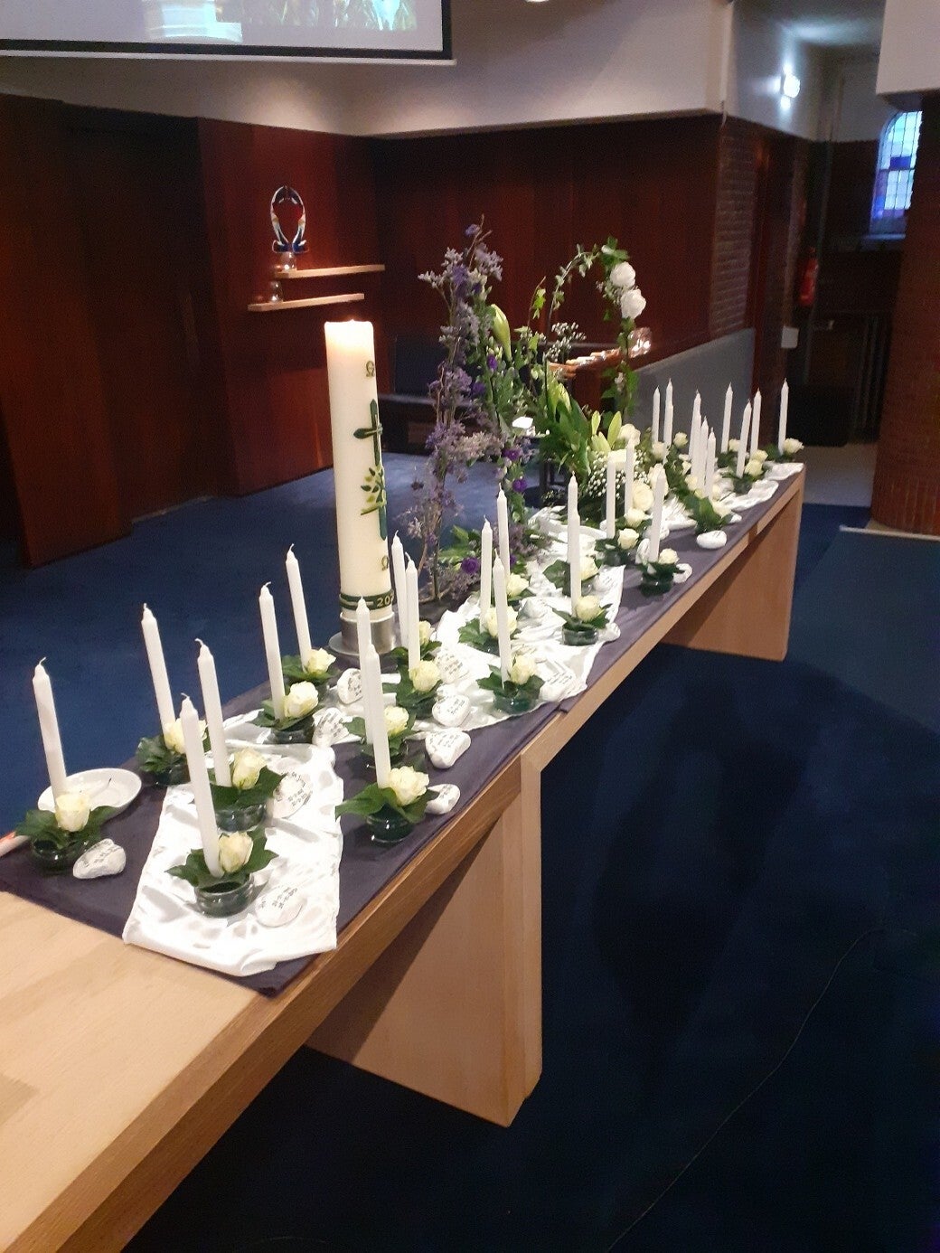 De contactpersoon van de overledene sturen wij een paar weken voorafgaande aan de dienst een brief met de uitnodiging voor de dienst op de zondagmorgen, en ook voor de zaterdagmiddag er vóór, waar een kaarsje kan worden aangestoken. Indien gewenst is het mogelijk om een foto en/of een tekst te sturen voor op de beamer, wat tijdens het oplezen van de naam, op het scherm te zien zal zijn.